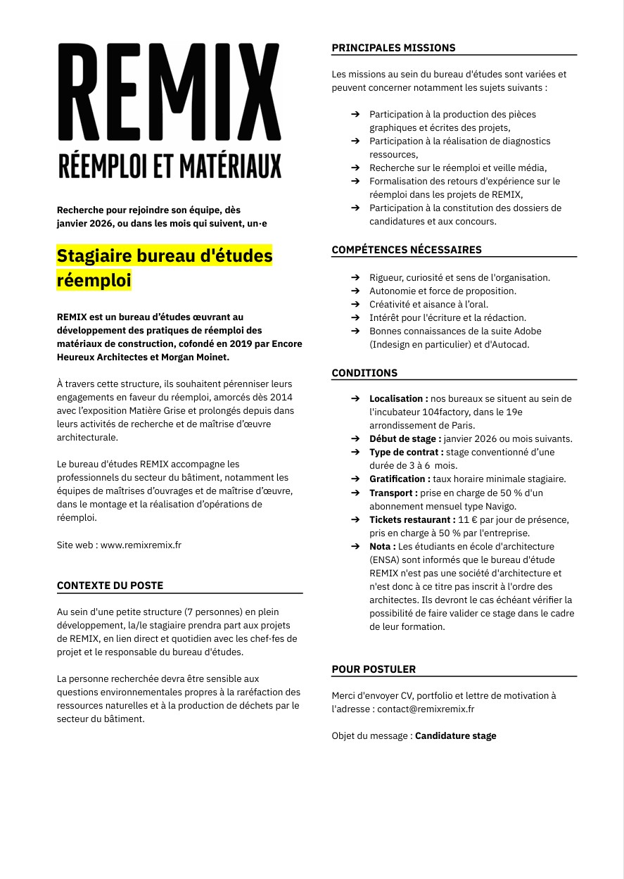 Le bureau d’études réemploi REMIX recrute un·e stagiaire architecte et/ou ingénieure pour rejoindre son équipe dès janvier 2026.