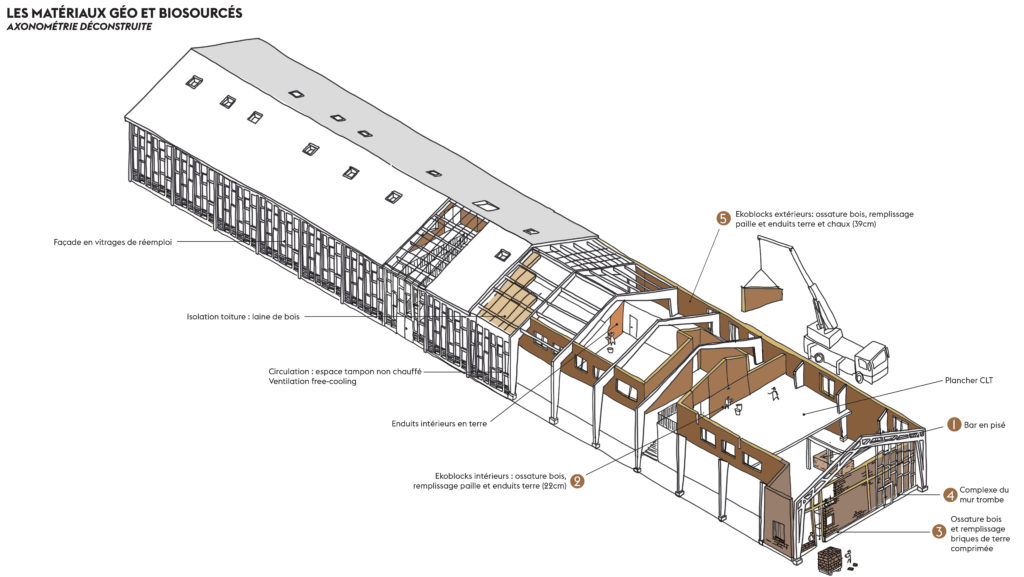 On retrouve du réemploi sur la façade Sud, côté restaurant, qui met en oeuvre des BTC (Briques de terre comprimée) initialement fabriquées pour le festival Bellastock en 2017. A nouveau, celles-ci sont mises en oeuvre dans une logique bioclimatique suivant le principe du mur trombe : une paroi vitrée placée à l’extérieur, à 10 cm des briques, permet de capter les apports de chaleur solaire qui seront emmagasinés grâce à la forte inertie des BTC pour être redistribuée dans l’espace du restaurant. Le tout sera ventilé par des prises d’air en partie basse et haute de la paroi.